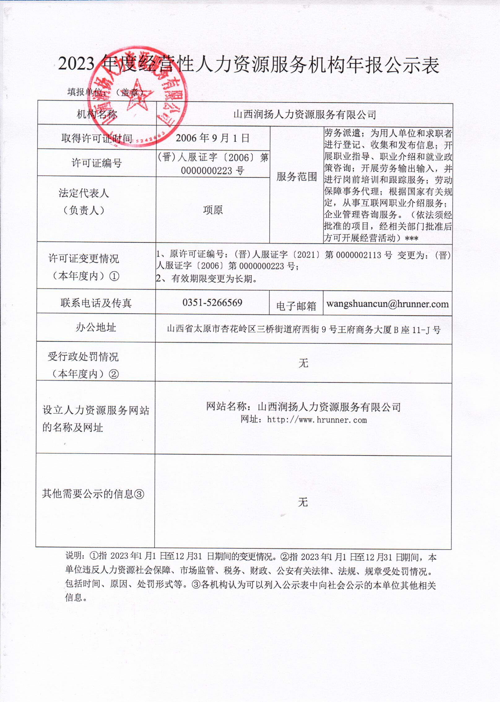 山西润扬2023年度经营性人力资源服务机构年报公示表